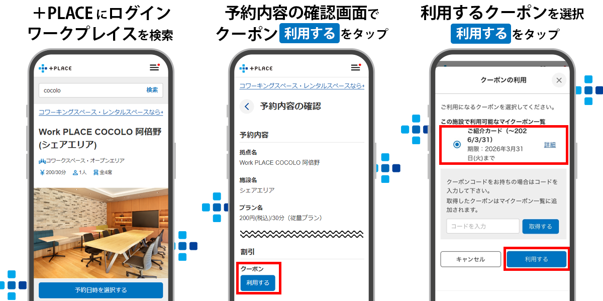 ①各種会員で+PLACEにログインし、ワークプレイスを検索